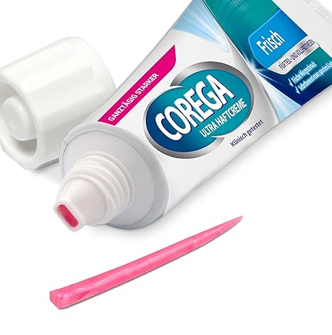 Corega Ultra Mint Denture Fixative Cream - 40g Tube helps secure dentures firmly throughout the day. Provides comfortable wear and prevents slippage. Maintains freshness and clean feeling in the mouth. Suitable for daily use with long-lasting hold. Leaves a pleasant minty taste. Ideal for those seeking reliable denture stability and comfort.