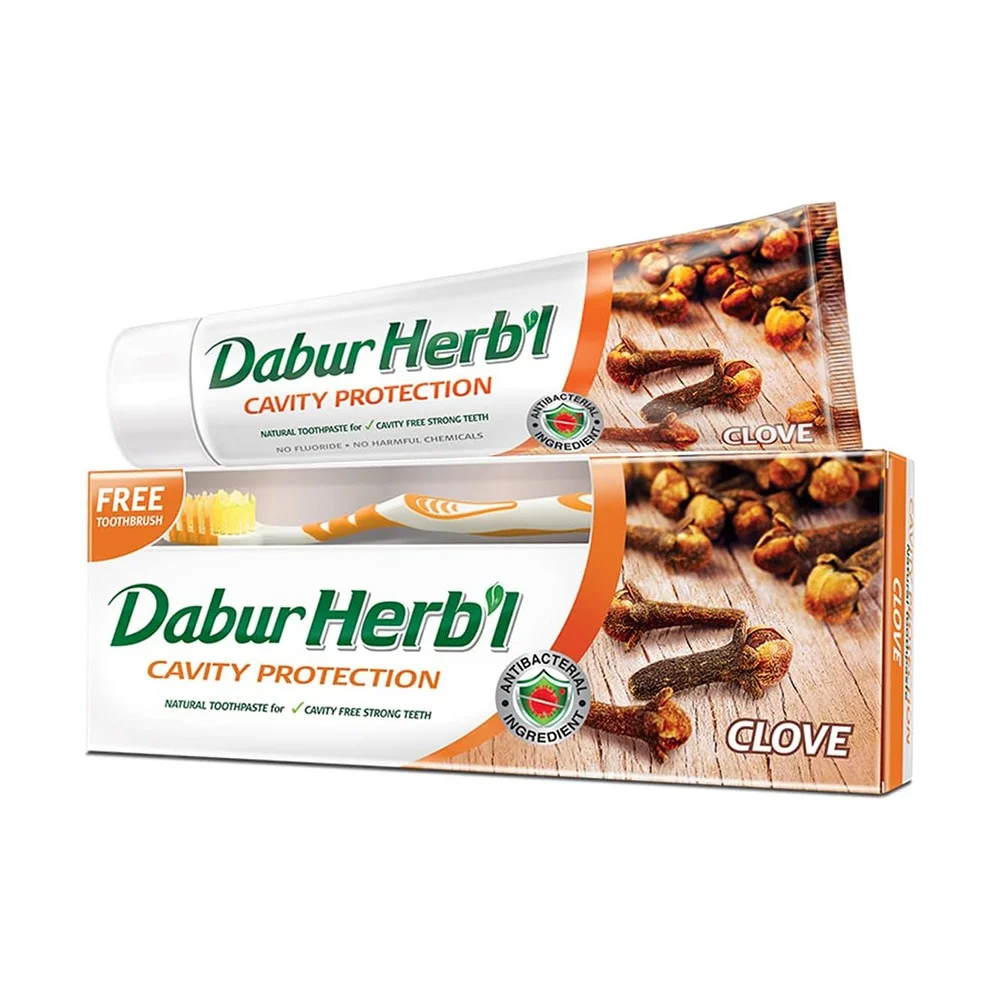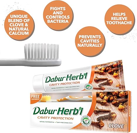 Dabur Herbal Cavity Protect Clove Toothpaste - 140 gm + Toothbrush (Pack Of 2) provides deep cleaning with natural clove extracts. Helps prevent cavities and strengthens enamel. Supports healthy gums and removes plaque effectively. Leaves breath fresh and clean. Suitable for daily use and gentle on teeth. Ideal for those seeking herbal cavity protection along with toothbrush care.