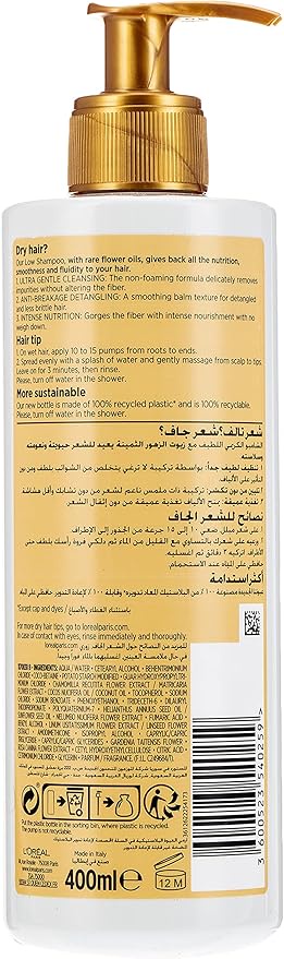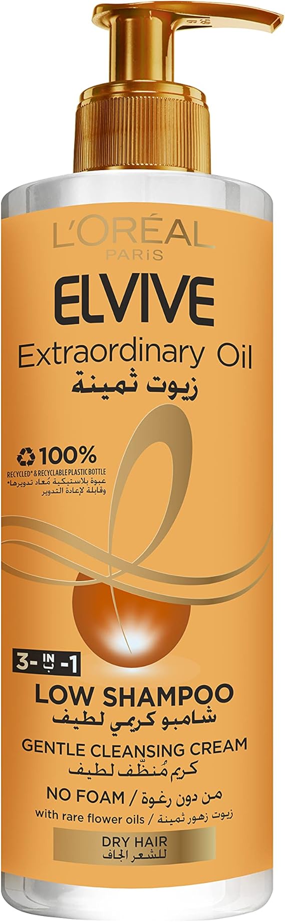 يقوم L'Oreal Elvive Extraordinary Oil Low 3in1 Shampoo بتنظيف الشعر وتغذيته وترطيبه في خطوة واحدة. تركيبته الخفيفة تحتوي على زيوت تغذي الشعر بعمق وتعيد له النعومة واللمعان. يقوي الشعر ويقلل الجفاف، ويتركه ناعماً وسهل التحكم فيه. مناسب لجميع أنواع الشعر، بما في ذلك الجاف أو التالف. غني بالزيوت المغذية التي تحسن صحة الشعر ومرونته. يترك شعرك ناعماً، صحيًا ومشعًا بالجمال بعد كل غسلة.