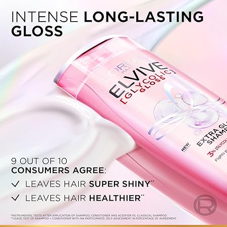L’Oréal Paris Elvive Glycolic Gloss Extra Gloss Shampoo with 3% Glycolic Acid revitalizes dull and porous hair. Its glycolic acid formula gently exfoliates the scalp and hair fibers to restore shine and smoothness. The shampoo nourishes and strengthens hair while reducing dryness and frizz. Suitable for dull, porous, or chemically treated hair. Enhances hair’s natural brilliance and manageability. Leaves hair glossy, soft, and beautifully radiant with every wash.