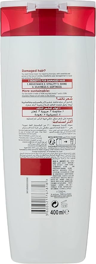 يقوم L’Oréal Paris Elvive Total Repair 5 Repairing Shampoo بعلاج خمسة مشاكل للشعر التالف: التكسر، الضعف، الخشونة، فقدان اللمعان، والأطراف المتقصفة. تركيبته الغنية تقوي وتغذي خصل الشعر. يعيد النعومة والملمس السلس واللمعان الطبيعي. مناسب لجميع أنواع الشعر وخاصة التالف أو المعالج كيميائيًا. يساعد على إصلاح التلف ويمنع التكسر المستقبلي. يترك شعرك صحيًا، ناعمًا ومرتاحًا بشكل رائع بعد كل غسلة.
