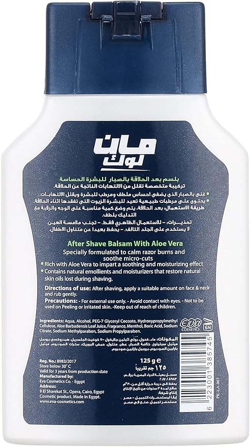 يقدم Man Look After Shave Balsam مع الألوفيرا عناية لطيفة للبشرة الحساسة بعد الحلاقة. تركيبته المهدئة تقلل التهيج والاحمرار فور الاستخدام. غني بمستخلص الألوفيرا الطبيعي، يغذي البشرة ويعيد ترطيبها ويحميها. يمتص البلسم بسرعة دون أن يترك أي أثر دهني. يترك البشرة ناعمة وملساء ومنتعشة طوال اليوم. الخيار الأمثل للرجال الباحثين عن تجربة بعد الحلاقة مريحة ومنعشة.