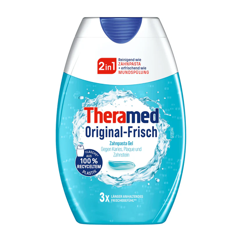 Theramed Toothpaste Gel 2in1 Original-Fresh 75 mL combines toothpaste and mouthwash in one powerful formula. Provides effective plaque removal for a deep clean. Ensures long-lasting fresh breath with its invigorating mint blend. Supports gum protection and strengthens enamel. Designed for daily use without causing sensitivity. A convenient and refreshing choice for complete oral hygiene.