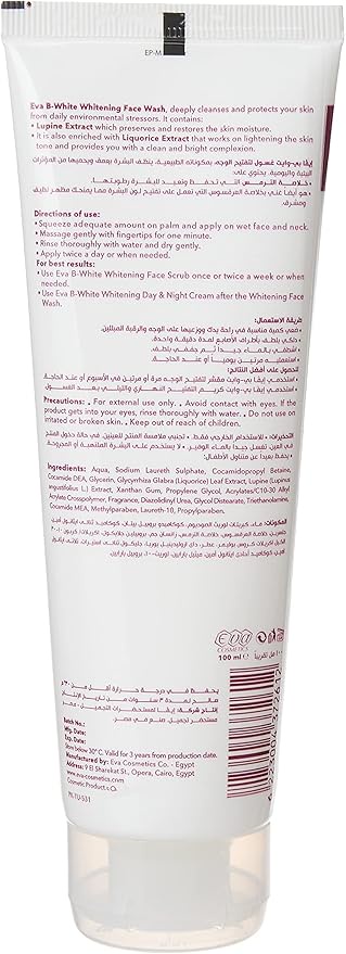Eva B-White Whitening Face Wash for normal skin deeply cleanses and brightens the skin, helping to even skin tone and reduce dark spots with a gentle daily formula.
