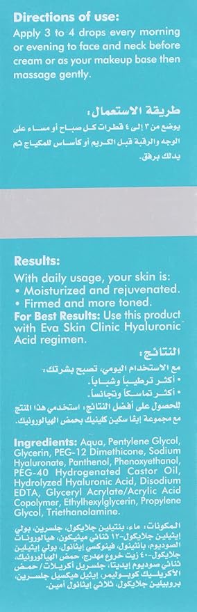 سيروم الوجه من إيفا بحمض الهيالورونيك 1.5٪ يعمل على ترطيب البشرة بعمق وتقليل التجاعيد، يساعد على شد البشرة وتحسين مرونتها للحصول على مظهر أكثر شبابًا وإشراقًا.