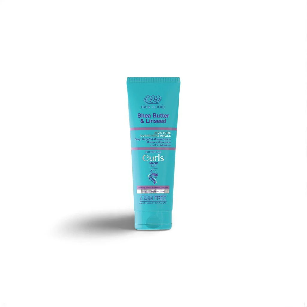 ماسك Eva Hair Clinic للشعر الكيرلي بزبدة الشيا وبذور الكتان يغذي الشعر بعمق، يحدد التموجات، ويمنحه نعومة ولمعان طبيعي يدومان.