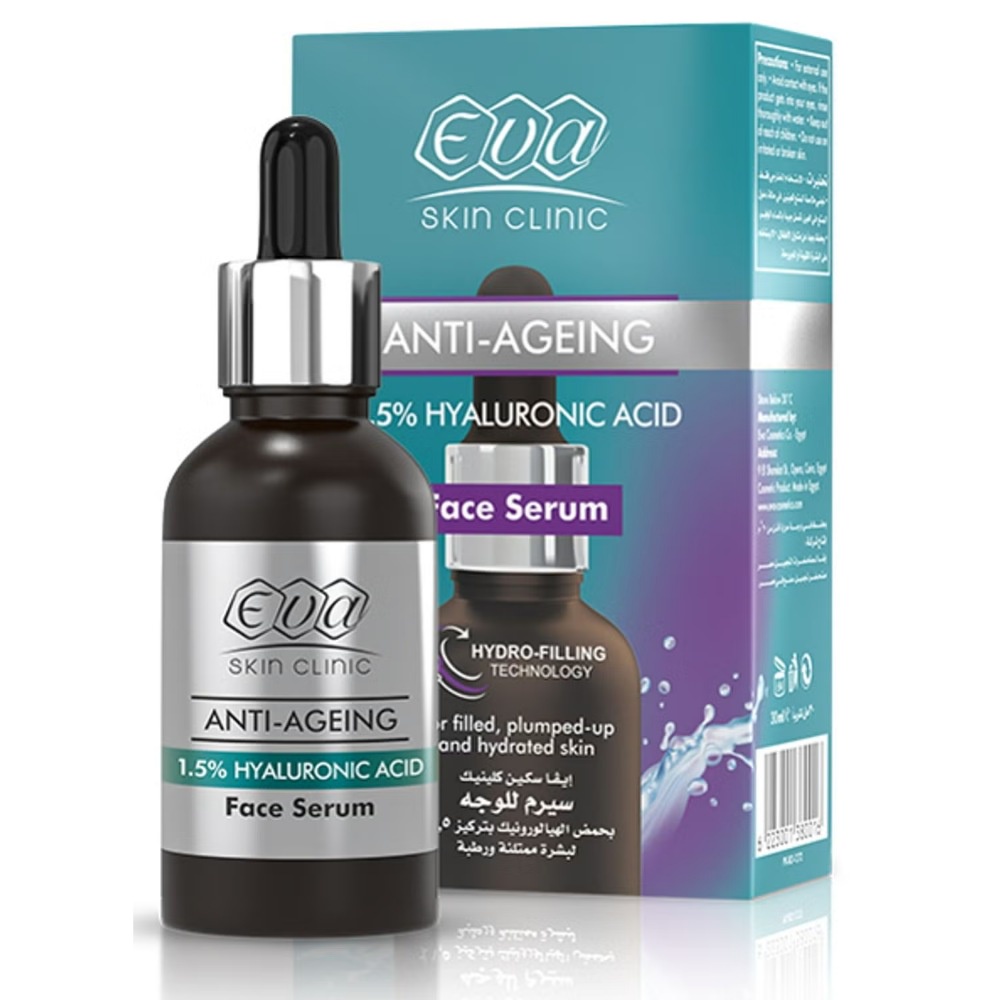 سر النضارة والشباب في قطرات! اكتشفي قوة سيروم إيفا سكين كلينيك بحمض الهيالورونيك. هل تبحثين عن بشرة مفعمة بالحيوية وخالية من الخطوط الدقيقة؟ يقدم لكِ سيروم الوجه المضاد لعلامات تقدم السن من "إيفا سكين كلينيك" (Eva Skin Clinic Anti-Ageing Face Serum) الحل الأمثل. بتركيزه العالي من حمض الهيالورونيك، صُمم هذا السيروم ليكون جرعة ترطيب مكثفة تعيد لبشرتك مرونتها، نضارتها، ومظهرها الممتلئ والشاب.